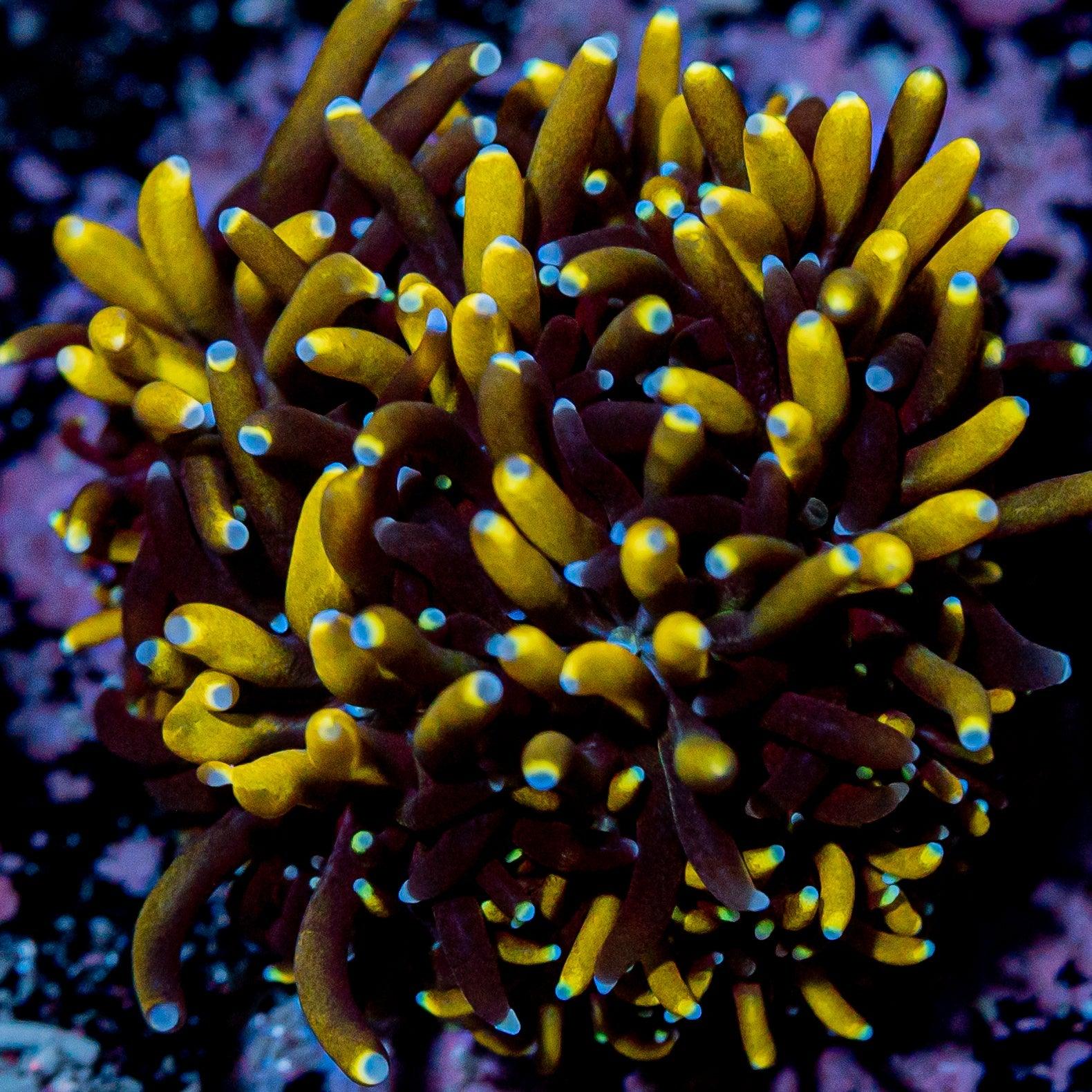 O Galaxea Gold (Galaxea fascicularis) é um coral LPS (Large Polyp Stony Coral) extremamente vibrante, conhecido por seus tentáculos dourados fluorescentes e longo alcance de alimentação, criando um efeito impressionante no aquário marinho. Seu movimento ondulante na correnteza adiciona um toque dinâmico e sofisticado ao reef.